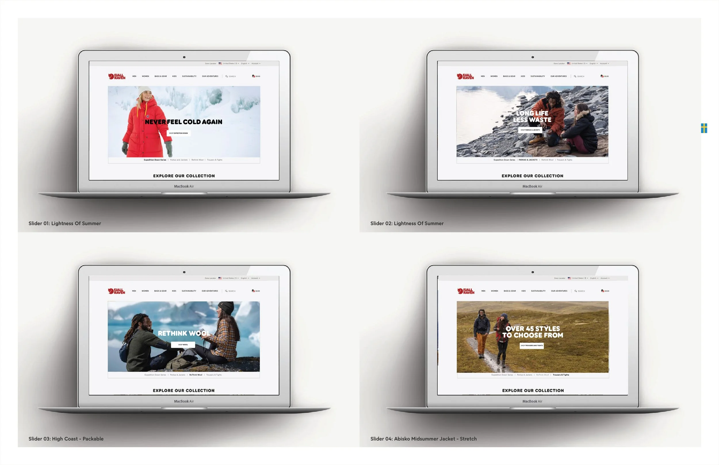From these insights, I developed a visual language rooted in cold alpine landscapes, winter trekking scenes, and the soft light of the Arctic. The imagery paired authentic outdoor settings with archival expedition photography, creating a bridge between heritage and modernity. Classic Fjällräven colors—deep reds, earthy greens, and arctic blues—were integrated throughout the system, directly tying the campaign back to the brand’s most iconic jackets and winter gear. Every design choice reflected the rugged beauty of the northern Swedish alpine while reinforcing the values of craftsmanship and sustainability.